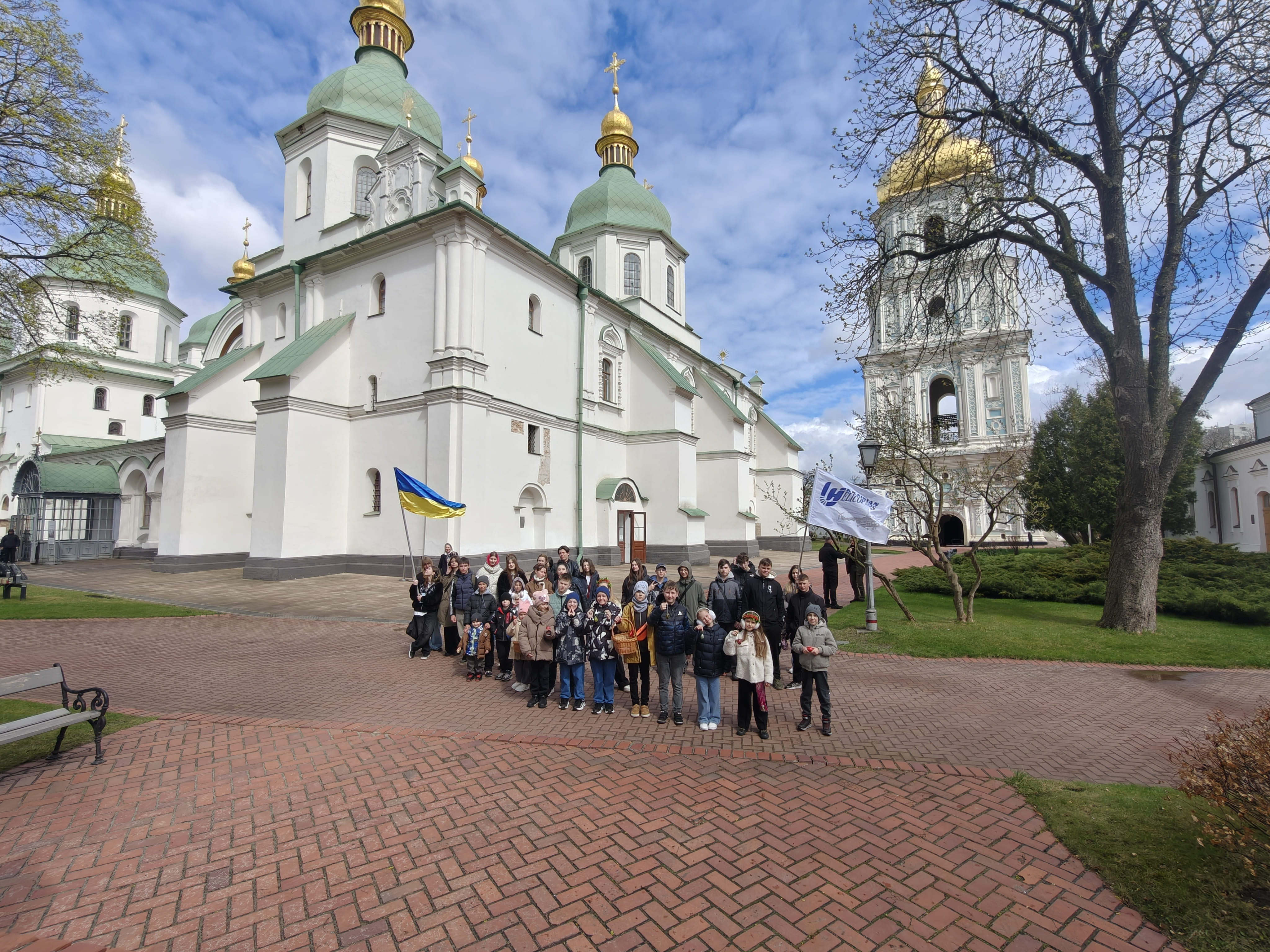 Тисячолітні стіни Софії Київської. Група дітей із цікавістю розглядає склепіння собору та Оранту. Саме так розпочався святковий захід для 40 дітей-сиріт загиблих Захисників та Захисниць, який організувала авіакомпанія "Українські вертольоти".
