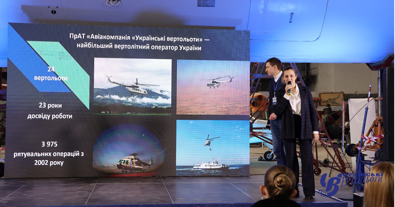 Директор технічного департаменту авіакомпанії Тарас Ферлей спілкувався з кандидатами на посади в технічний відділ. А інженер з експлуатації повітряних суден приладів та електроустаткування Антон Шушаков у презентації діяльності авіакомпанії більше зосередився на історії розвитку «Українських вертольотів» та на переобладнанні повітряних суден під різні задачі. Він розповів, як саме авіакомпанія стала найбільшим вертолітним оператором України.