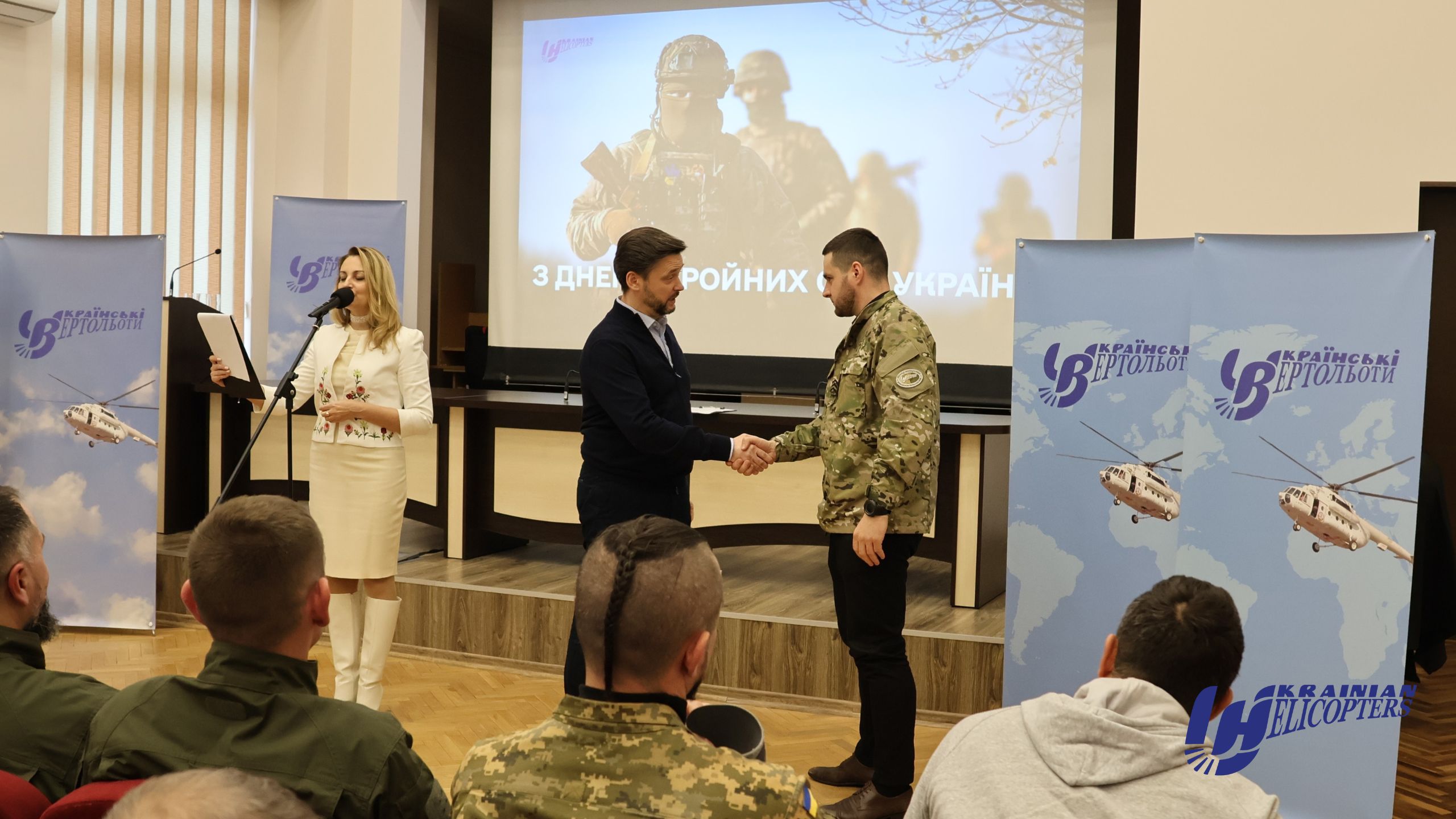 До дня Збройних сил України Головний виконавчий директор авіакомпанії «Українські вертольоти» Олег Рудь вручив подарунки учасникам бойових дій, які працюють в колективі. Урочиста зустріч з нагоди свята зібрала не лише ветеранів, але і повну актову залу колективу авіакомпанії.