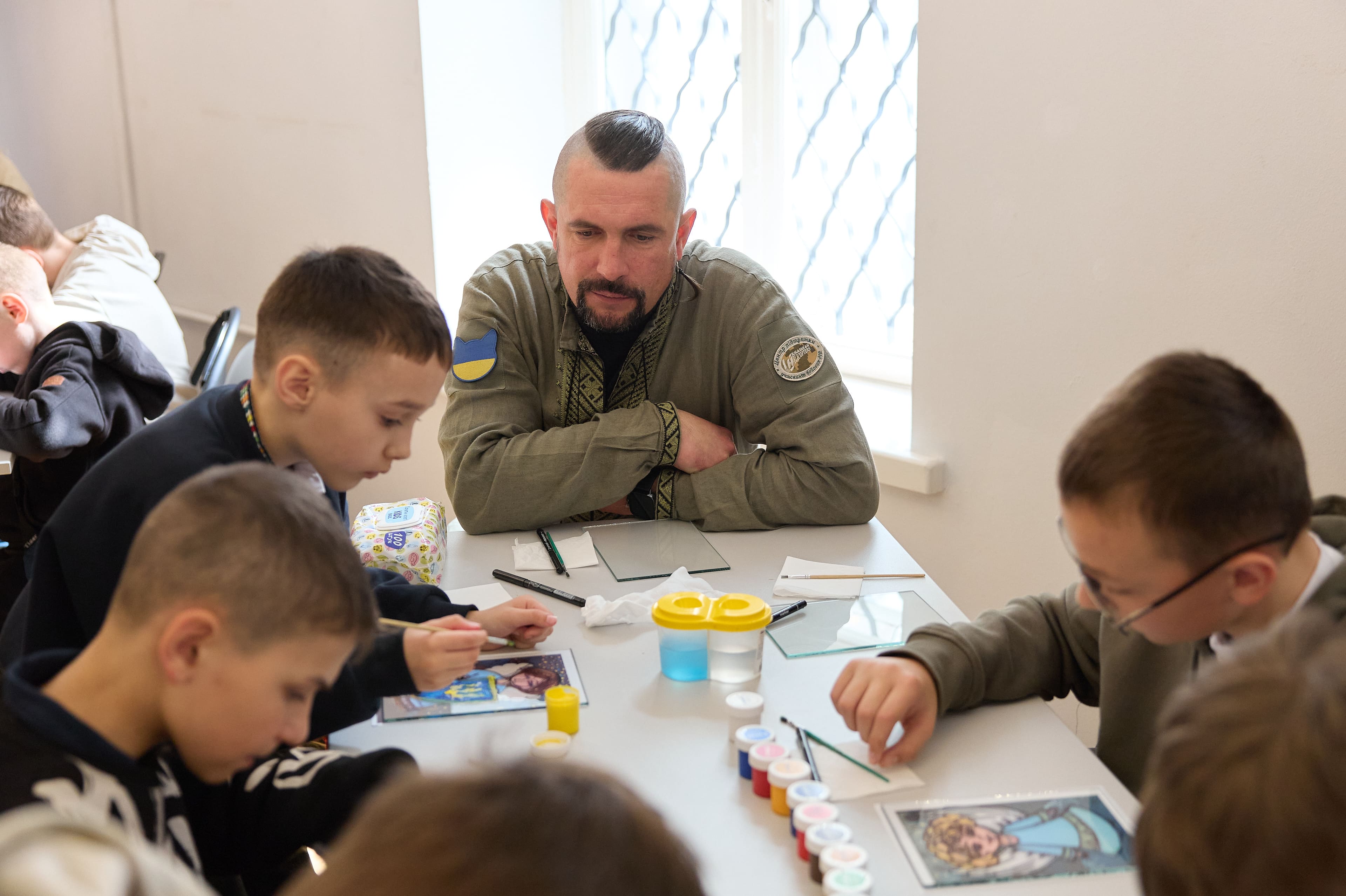 У програмі була також майстерка із малярства по склу — одного з давніх народних промислів. Усі малювали ангелів, які бережуть Україну та несуть щастя на свята. Дітям підказували і допомагали ментори благодійної платформи — серед них двоє ветеранів, які працюють в авіакомпанії.