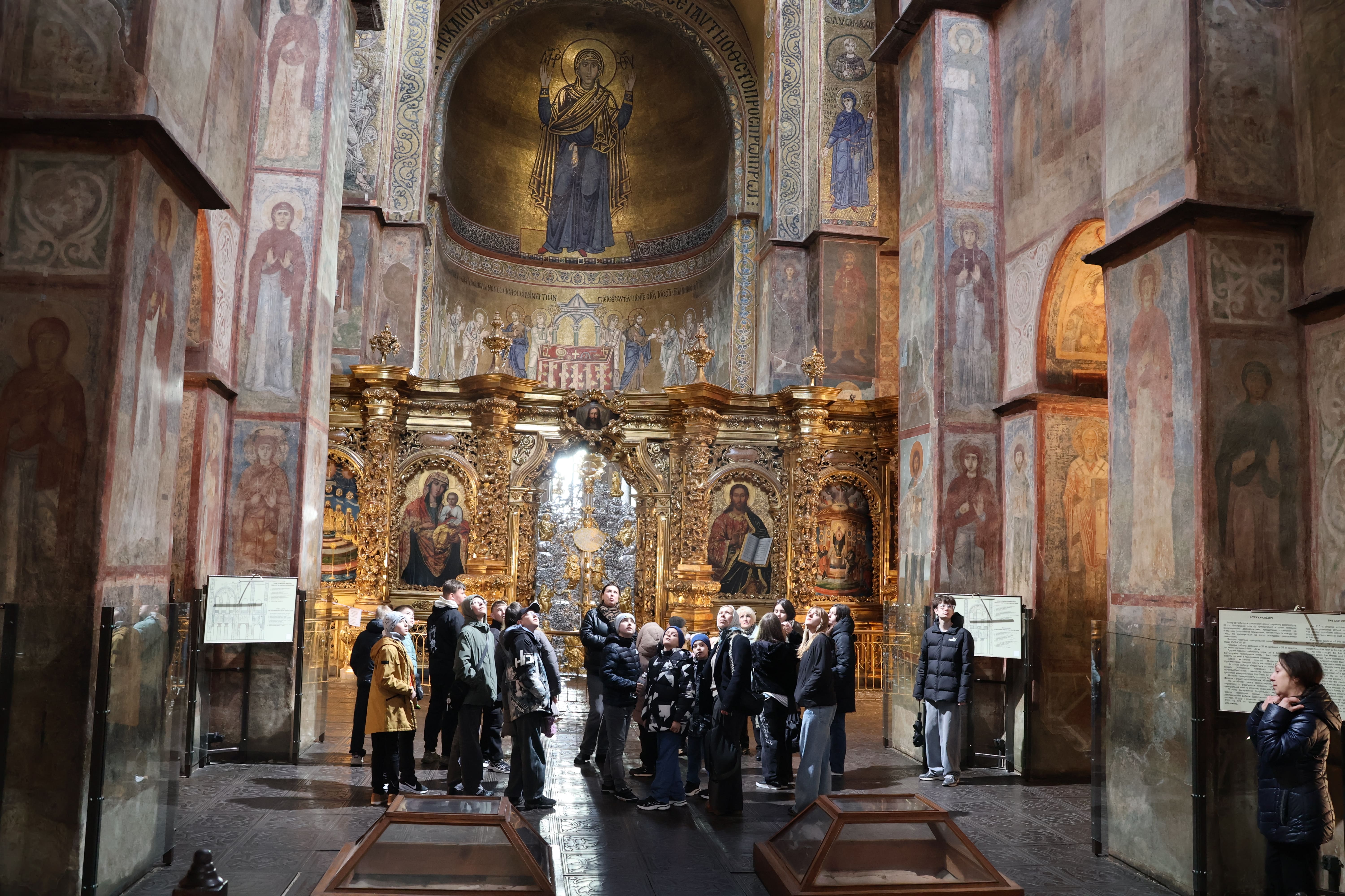 Тисячолітні стіни Софії Київської. Група дітей із цікавістю розглядає склепіння собору та Оранту. Саме так розпочався святковий захід для 40 дітей-сиріт загиблих Захисників та Захисниць, який організувала авіакомпанія "Українські вертольоти".